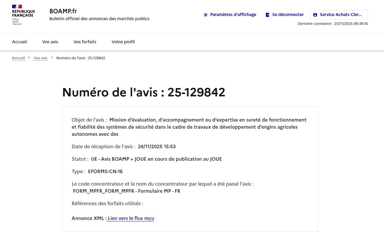 Métadonnée "intitule" : Mission d’évaluation, d’accompagnement ou d’expertise en sureté de fonctionnement et fiabilité des systèmes de sécurité dans le cadre de travaux de développement d’engins agricoles autonomes avec des partenaires d’INRAE